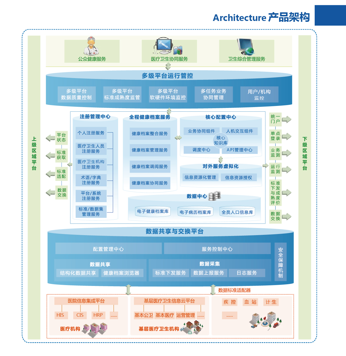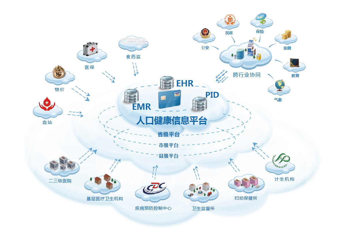 人口健康信息平臺是以信息“惠民”、“惠政”、“惠醫”、“惠業”為設計理念,采用當今主流并且成熟的云計算、大數據、物聯網等IT技術,構建省、市、縣(區)三級衛生信息云服務平臺,實現區域內衛生計生委、CDC、婦幼保健機構、衛生監督機構、社區衛生服務機構、綜合醫院等各個橫向業務機構和縱向管理機構信息互聯互通與業務協作,構建城市級人口健康數據庫,為轄區社會公眾提供分級的、連續的、安全的、便捷的醫療衛生信息云服務,提升基本醫療衛生服務的可及性及公平性,促進形成有效的分級診療服務體系,優化區域醫療資源配置,提高醫療服務水平和醫療質量,降低醫療費用,提升衛生綜合管理水平和政府綜合決策能力。